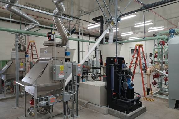 At Joint Base McGuire-Dix in Lakehurst, New Jersey, AFC designed dual processing lines for a new water treatment plant featuring AFC Dump-Clean bag break stations and AFC Spiralfeeder screw conveyors for transferring powdered lime automatically.